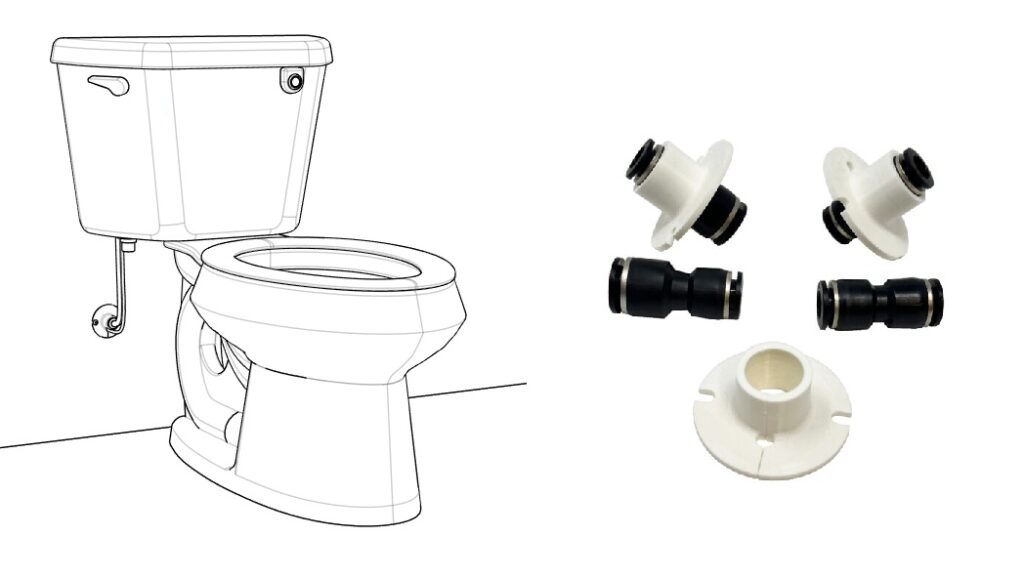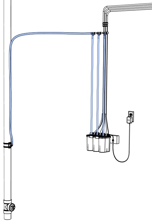 The smart design of the Potty Sniffer system allows for air exhaust lines and control signal cables to be easily incorporated and routed from each toilet to a centrally located Sniffer pump cluster during new home construction. Standard flexible vinyl (PVC) or polyethylene (PE) tubing and 4-conductor flat modular cable (telephone cable) is used for the connections and can be installed as part of the electrical or mechanical build phase of construction. Sniffer pump clusters can service up to three bathrooms and combines the air exhaust of three separate Sniffer pumps into a single 1/2″ sanitary plumbing vent or 1/2″ through wall fitting. Toilets can be located 60′ away with standard 3/8″ O.D. tubing or up to 125′ away with 1/2″ O.D. tubing. A single power supply provides safe 12VDC power to each pump from a single 120VAC outlet.
