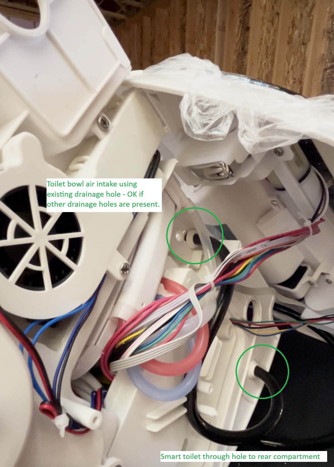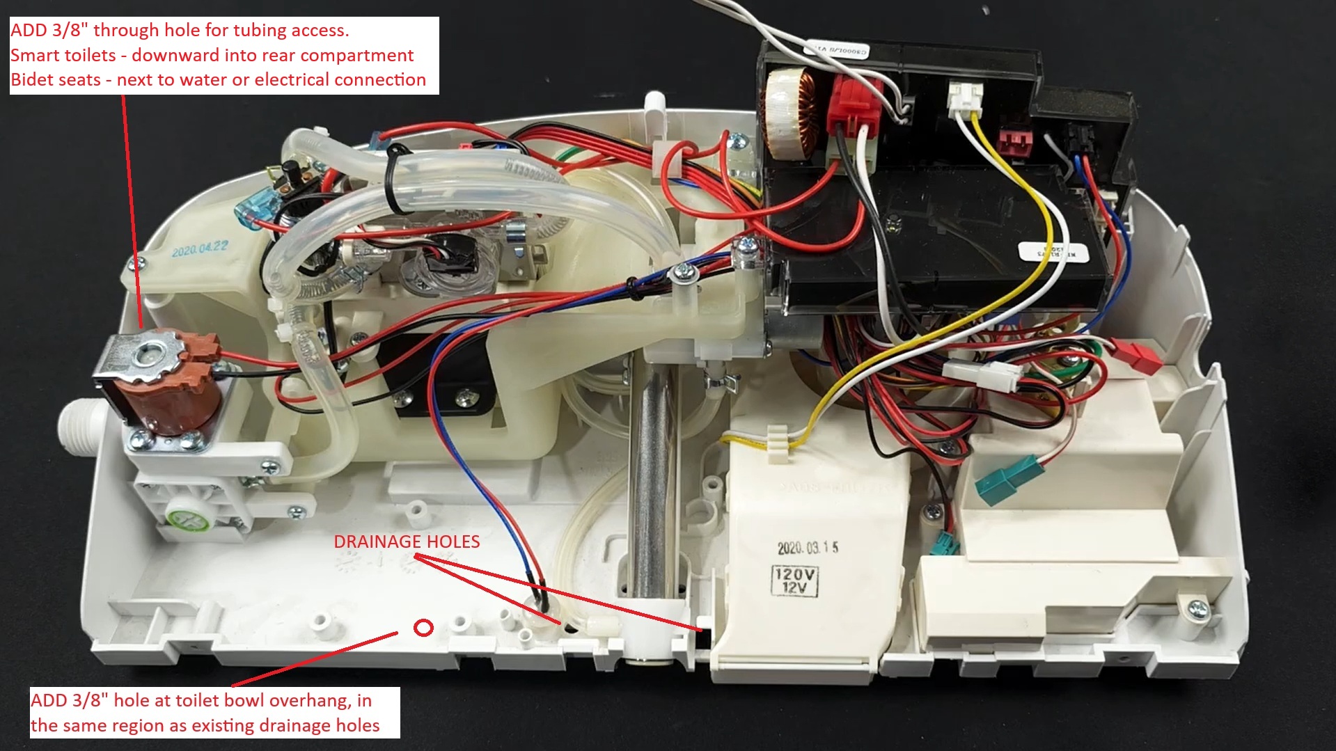 Converts smart toilet to accept a Sniffer system air intake tubing connection. Smart toilet bidet seat needs to be disassembled and opened up for internal modifications to add the required tubing access holes. Contact a repair professional for installation, if required.